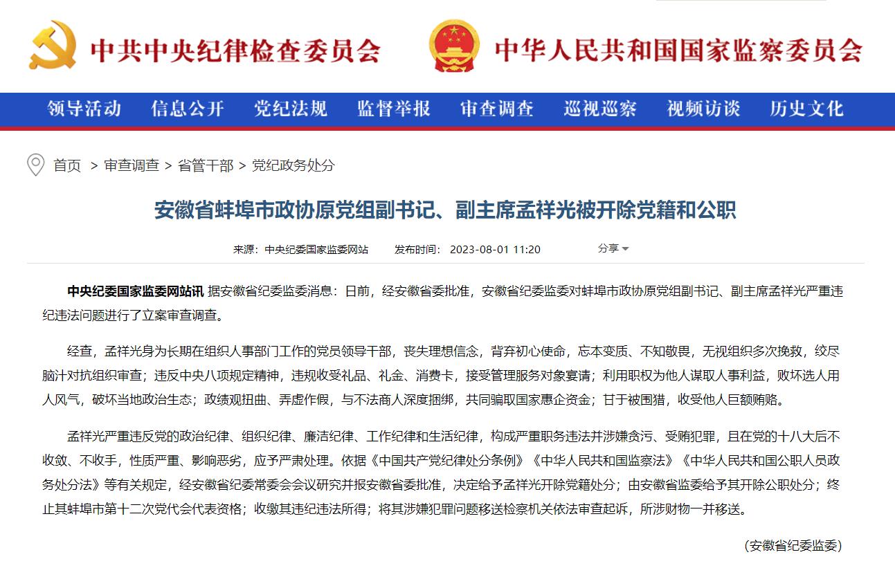 央视网消息:中央纪委国家监委网站8月1日通报,据安徽省纪委监委消息:日前,经安徽省委批准,安徽省纪委监委对蚌埠市政协原党组副书记、副主席孟祥光严重违纪违法问题进行了立案审查调查。