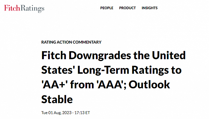 8月1日,惠誉将美国长期外币发行人违约评级由“AAA”下调至“AA+”,展望为稳定。惠誉认为,美国评级下调反映了未来三年预期的财政恶化,高且不断增长的政府债务,以及过去二十年相对于“AA”和“AAA”评级同行的治理侵蚀,这表现在反复的债务限额僵局和最后一刻的决议。