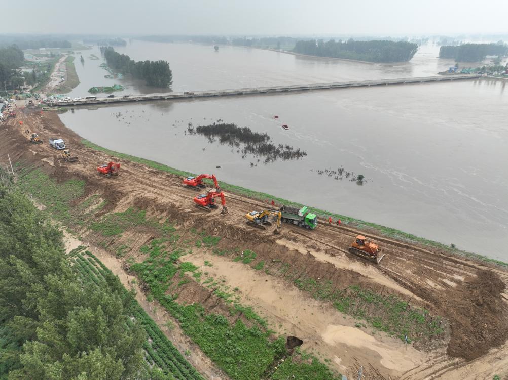 中国安能救援队正在保定市白沟河一处堤防抢险现场作业。(张小明摄)