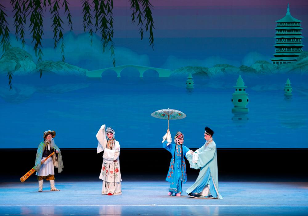 8月5日,来自成都市京剧研究院的演员表演《白蛇传·游湖》。新华社记者沈伯韩摄