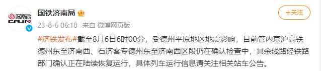 央视网消息:据@国铁济南局 消息,截至8月6日6时00分,受德州平原地区地震影响,目前管内京沪高铁德州东至济南西、石济客专德州东至济南西区段仍在确认检查中,其余线路经铁路部门确认正在陆续恢复运行,具体列车运行信息请关注相关站车公告。