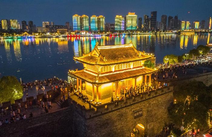 夜幕降临,襄阳古城灯光璀璨、游人如织。(杨东 摄)