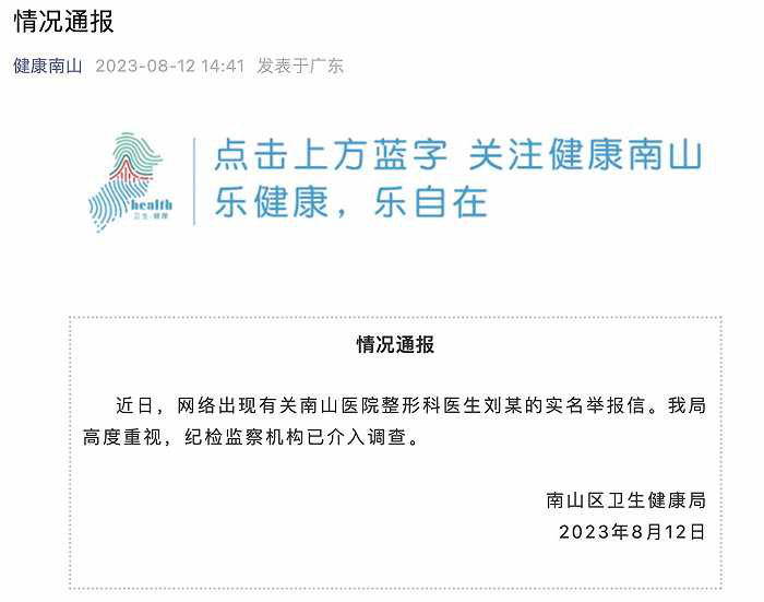 ·网传南山医院整形科医生刘某被实名举报,官方通报:纪检监察机构已介入调查。