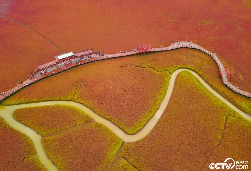 2023年8月11日,辽宁盘锦,红海滩碱蓬草迎来最佳观赏期。