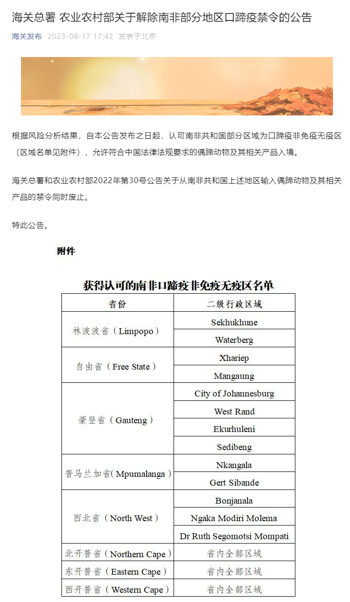 央视网消息:据“海关发布”8月17日消息,海关总署、农业农村部发布关于解除南非部分地区口蹄疫禁令的公告,根据风险分析结果,自本公告发布之日起,认可南非共和国部分区域为口蹄疫非免疫无疫区,允许符合中国法律法规要求的偶蹄动物及其相关产品入境。海关总署和农业农村部2022年第30号公告关于从南非共和国上述地区输入偶蹄动物及其相关产品的禁令同时废止。