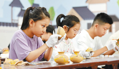 图为山东省枣庄市博物馆,孩子们在体验修复文物。