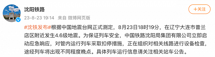 央视网消息:据@沈阳铁路 微博消息,根据中国地震台网正式测定,8月23日18时19分,在辽宁大连市普兰店区附近发生4.6级地震。为保证列车安全,中国铁路沈阳局集团有限公司立即启动应急响应,对管内运行列车采取扣停措施,正在组织对相关线路进行设备检查,途经列车将出现不同程度晚点。具体列车运行信息请关注相关站车公告。