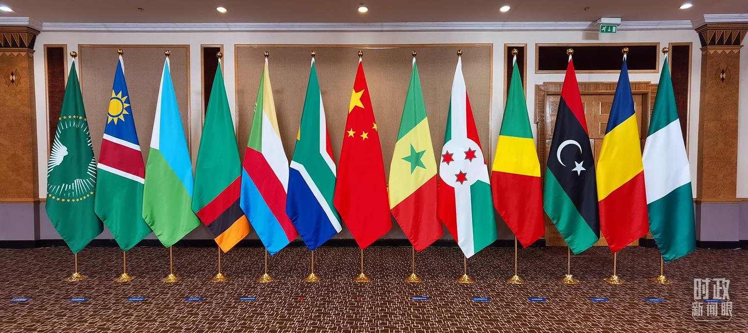 △中非领导人对话会会场摆放的与会各方旗帜。(总台央视记者郭鸿拍摄)