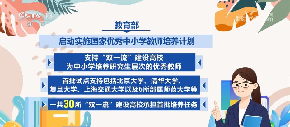 教育部启动实施国家优秀中小学教师培养计划,支持“双一流”建设高校为中小学培养研究生层次的优秀教师,首批试点支持包括北京大学、清华大学、复旦大学、上海交通大学以及6所部属师范大学等,一共30所“双一流”建设高校承担首批培养任务。
