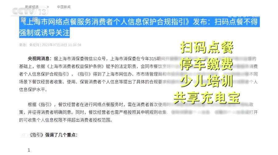 为了加强个人信息保护,上海市消保委自7月起针对扫码点餐、停车缴费、少儿培训和共享充电宝等四种消费场景,分别出台了合规指引、自律承诺和合规清单。未来,还将针对房产中介、商超购物等主要消费场景作出相应指引。