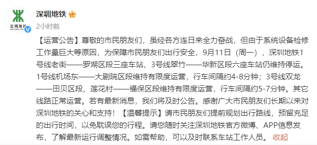 央视网消息:@深圳地铁 微博发布运营公告,虽经各方连日来全力奋战,但由于系统设备检修工作量巨大等原因,为保障市民朋友们出行安全,9月11日(周一),深圳地铁1号线老街——罗湖区段三座车站、3号线翠竹——华新区段六座车站仍维持停运。1号线机场东——大剧院区段维持有限度运营,行车间隔约4-8分钟;3号线双龙——田贝区段、莲花村——福保区段维持有限度运营,行车间隔约5-7分钟。其它线路正常运营。
