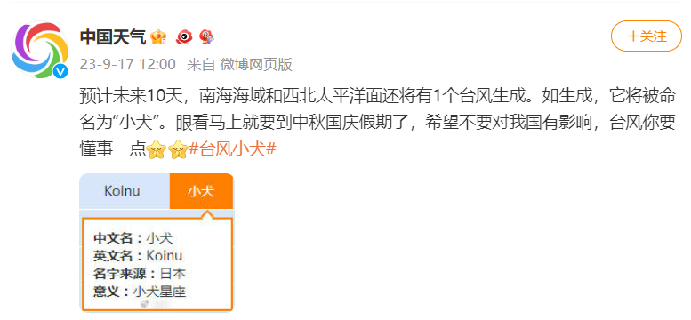 据@中国天气 微博消息,预计未来10天,南海海域和西北太平洋面还将有1个台风生成。如生成,它将被命名为“小犬”。