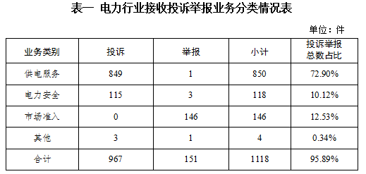 电力行业排在首位,数量为1118件、占投诉举报总数的95.89%,主要集中在供电服务、市场准入、电力安全等方面。