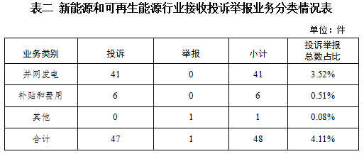 新能源和可再生能源行业排在第二位,数量为48件、占投诉举报总数的4.11%,主要集中在并网发电、补贴和费用等方面。