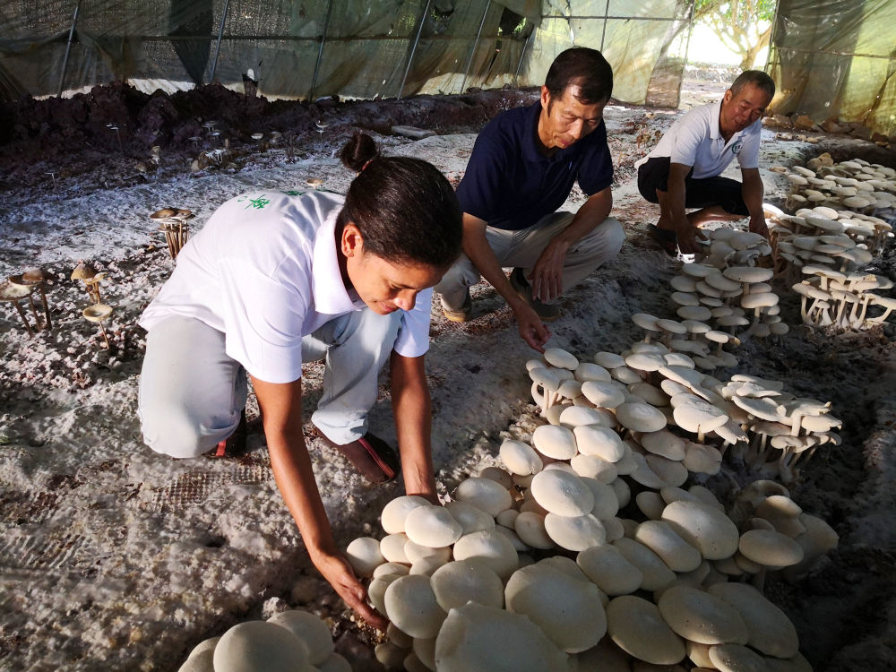 2018年6月12日,在斐济楠迪,中国专家和当地雇员在检查菌菇生长情况。新华社记者 张永兴 摄