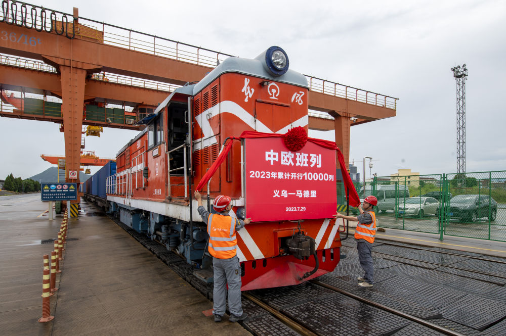 ↑2023年7月29日,满载110个标箱出口货物的X8020次中欧班列从铁路义乌西站准备启程。