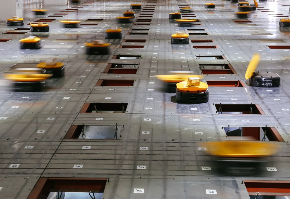 ↑2017年5月3日,在义乌申通公司,机器人运载包裹进行分拣。