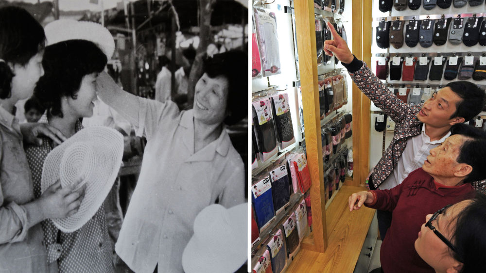 ↑拼版照片,左图为:义乌小商品市场第一代经营户冯爱倩(右)在向顾客推销遮阳帽(摄于上个世纪80年代);右图为:2018年10月25日,78岁的冯爱倩(中)在倾听她的孙子、义乌国际商贸城经营户杨帆(上)介绍他自产自销的新款袜子。杨帆大学毕业后当上了父亲创办的袜业公司的总经理。