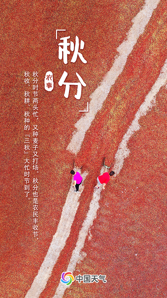 “秋分时节两头忙,又种麦子又打场。”秋分既意味着丰收的喜悦,也是耕种的标志。此时正是秋收、秋耕和秋种的“三秋”生产期,需重点防范初霜冻、华西秋雨、寒露风、大雾等天气对农业生产方面可能造成的不利影响。