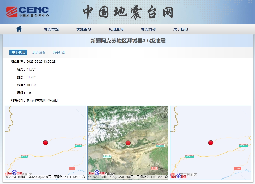 :中国地震台网通报,9月25日13时56分,新疆阿克苏地区拜城县(北纬41.76度,东经81.45度)发生3.6级地震,震源深度10千米。