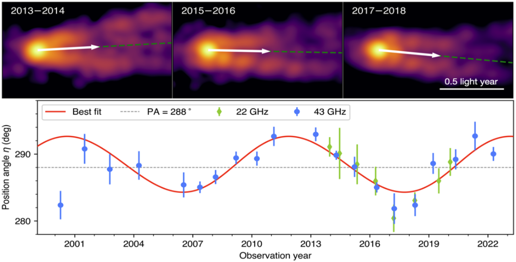 这项最新研究成果的论文第一作者兼通讯作者、之江实验室博士后崔玉竹介绍,利用甚长基线干涉测量(VLBI)技术,科研人员在解析M87黑洞喷流结构过程中,惊奇地发现东亚VLBI网在2017年3月观测到的M87黑洞喷流指向,与以往有所不同。紧盯这一蛛丝马迹,通过深入分析近23年来全球多个VLBI网的观测数据,最终发现M87黑洞喷流呈现周期性摆动,摆动周期约为11年,振幅约为10度。这首次为黑洞自旋理论提供了最有力的观测证据。