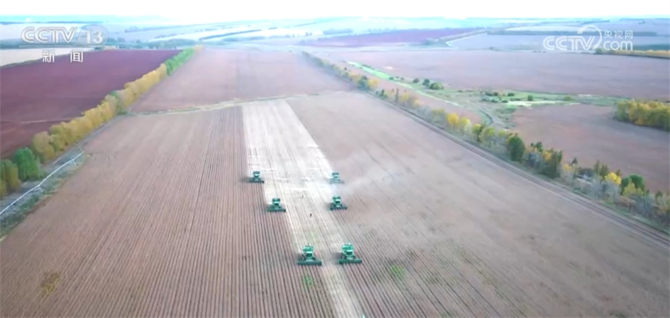 您现在看到的是黑龙江垦区鹤山农场的大豆“高产攻关”示范田,眼下正是大豆收获的高产期,农场每天出动52台收获机,节粮减损,确保丰收的粮食颗粒归仓。