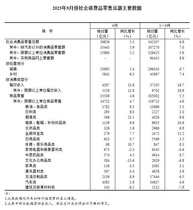 正在阅读:国家统计局:2023年9月份社会消费品零售总额增长5.5%