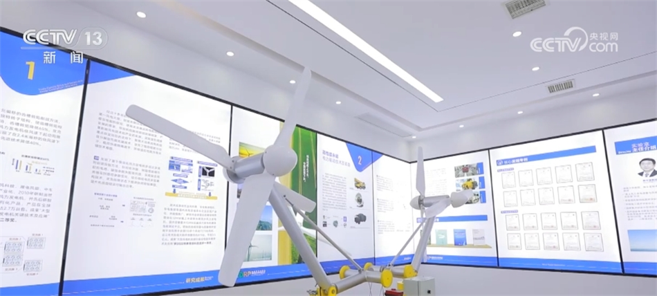 这台“20兆瓦级海上新型风力发电机组”模型正在进行测试,这是由国家重点研发计划批复立项的全国在研最大容量风电机组。这台风力发电机组由4组叶片构成,叶片高度、重心可调节,即便在离海岸线50公里以外的深海区也可以抵御台风等恶劣天气。