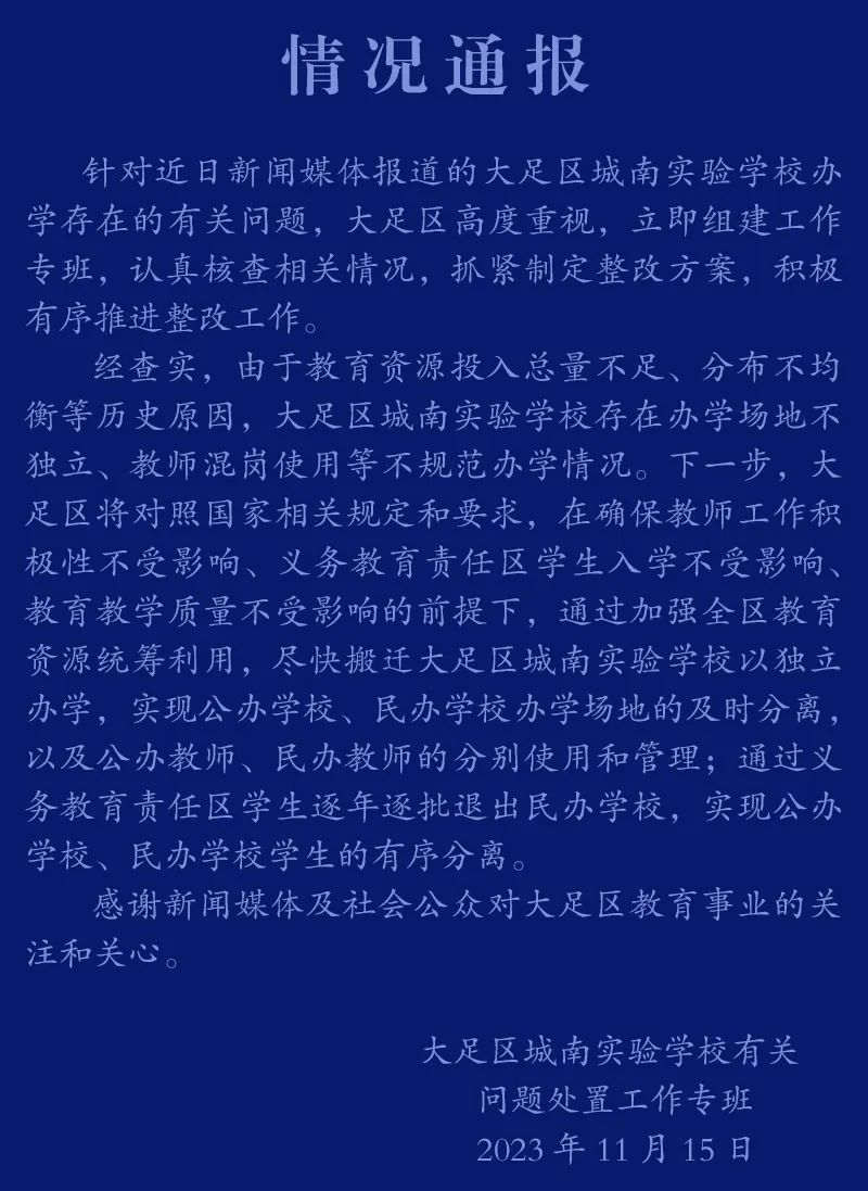 经查实,由于教育资源投入总量不足、分布不均衡等历史原因,大足区城南实验学校存在办学场地不独立、教师混岗使用等不规范办学情况。下一步,大足区将对照国家相关规定和要求,在确保教师工作积极性不受影响、义务教育责任区学生入学不受影响、教育教学质量不受影响的前提下,通过加强全区教育资源统筹利用,尽快搬迁大足区城南实验学校以独立办学,实现公办学校、民办学校办学场地的及时分离以及公办教师、民办教师的分别使用和管理;通过义务教育责任区学生逐年逐批退出民办学校,实现公办学校、民办学校学生的有序分离。