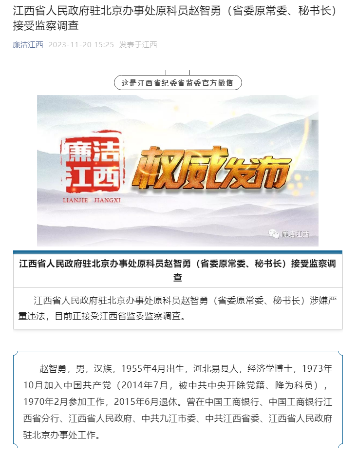 央视网消息:江西纪委监委11月20日通报,江西省人民政府驻北京办事处原科员赵智勇(省委原常委、秘书长)涉嫌严重违法,目前正接受江西省监委监察调查。
