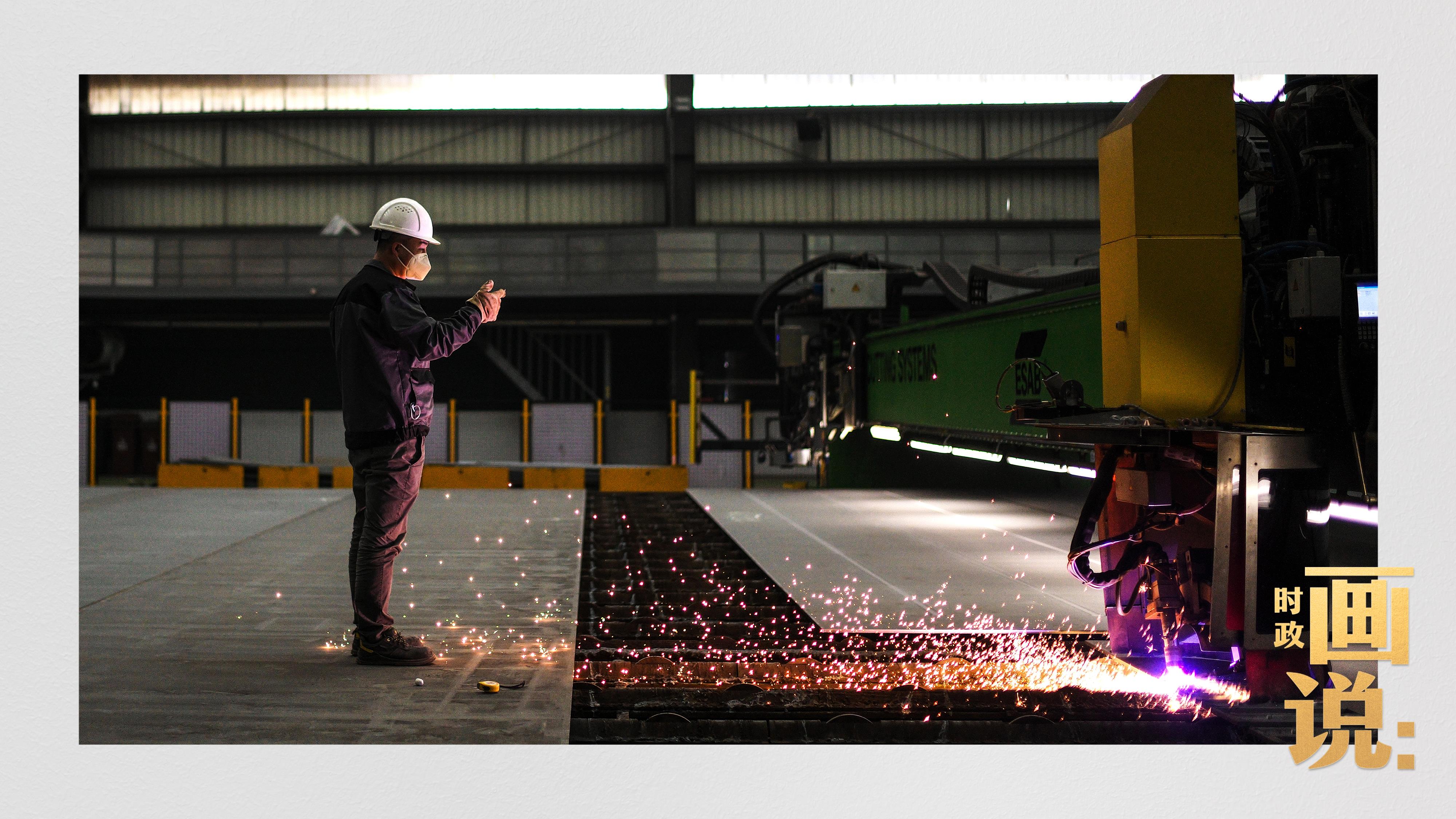 薄板智能生产中心内,激光切割机正在将特种钢板加工成标准零件。浦东新区,上海。