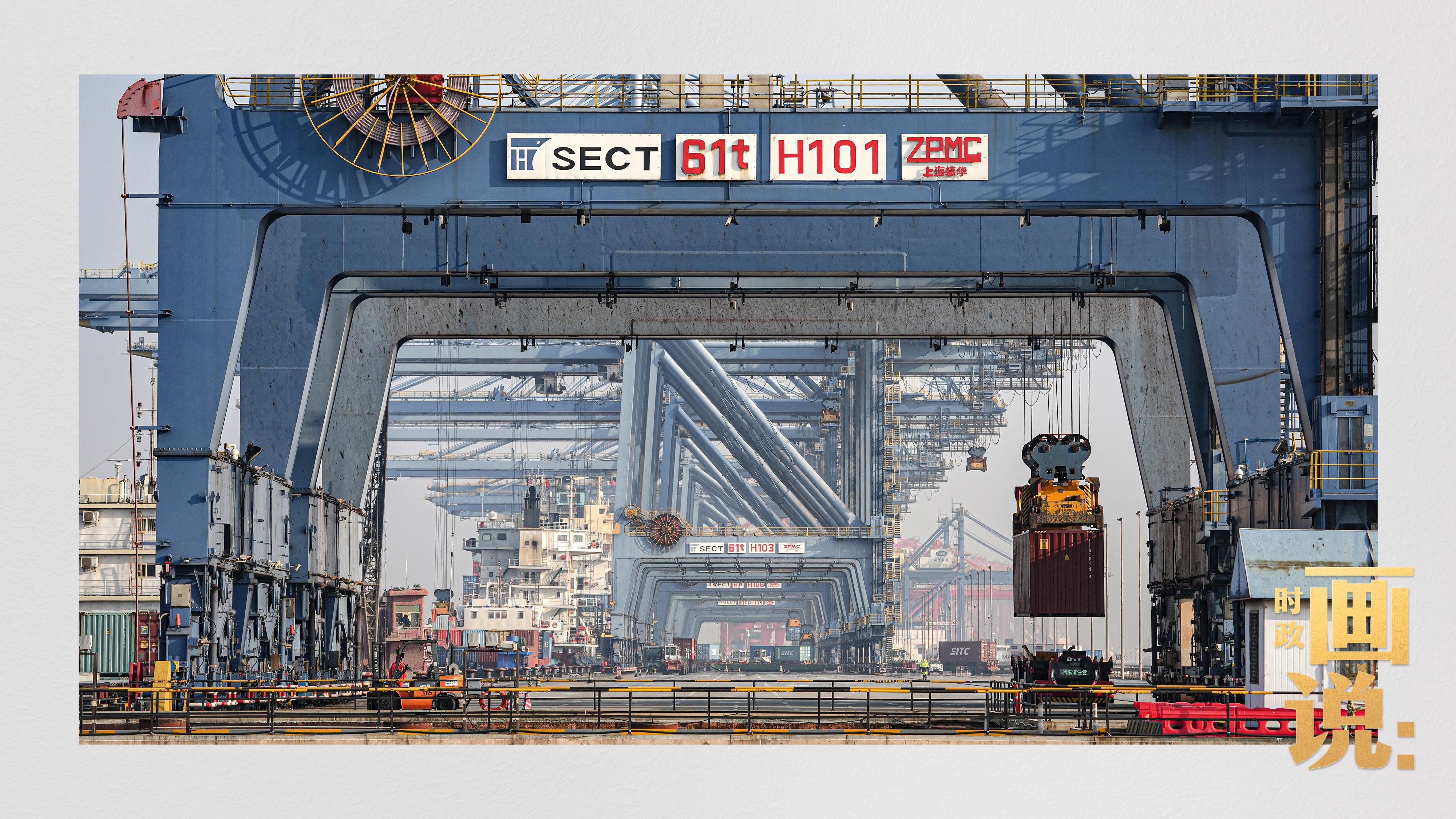 △上港集箱外高桥码头,巨型塔吊正在吊装集装箱货柜。浦东,上海。
