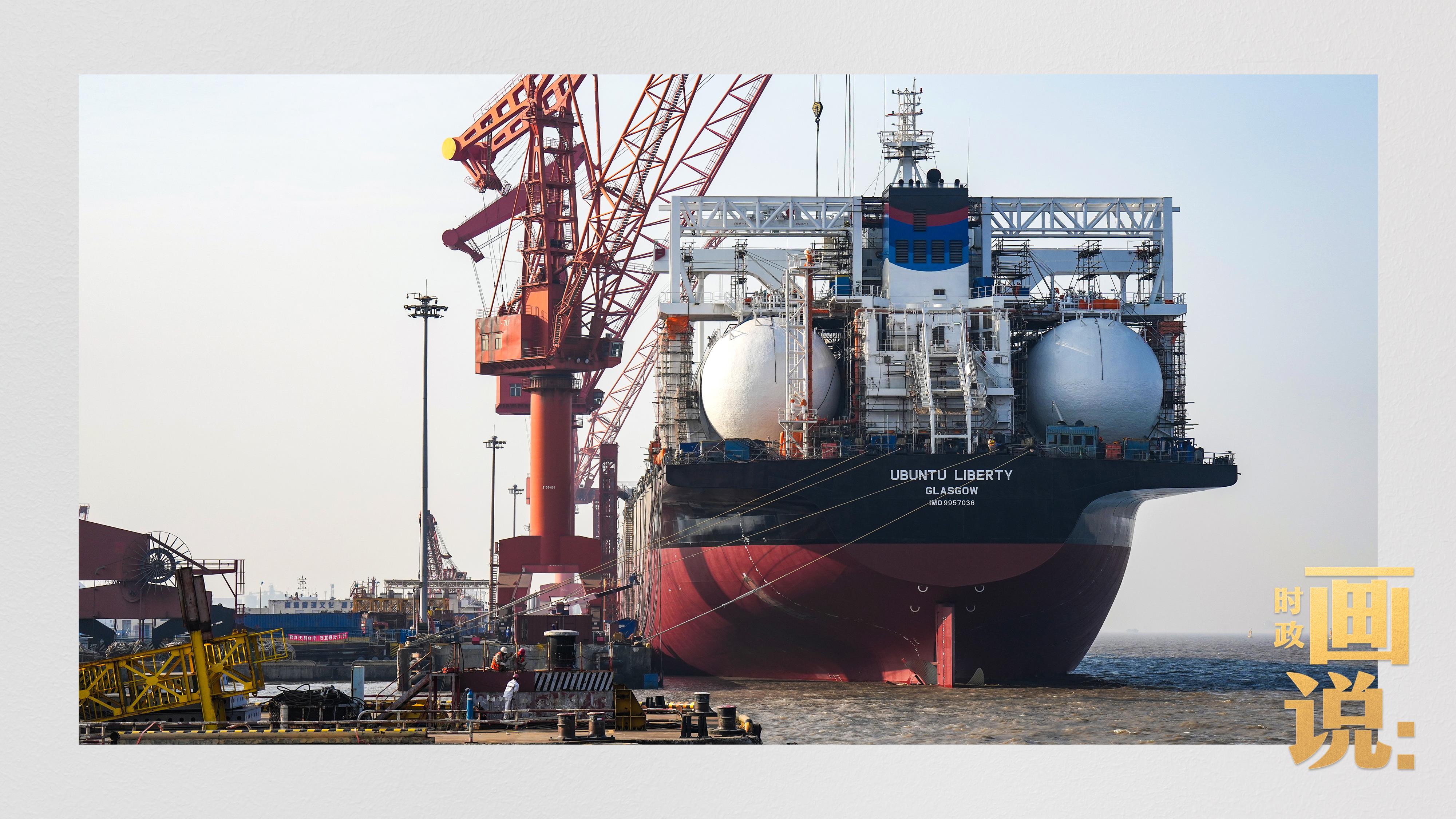△外高桥船坞码头旁,一艘建造中的巨型双燃料散货船停靠在泊位。浦东新区,上海