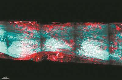 一只蝾螈在肌腱完全横断后,使用与正常肌腱相同的胶原蛋白再生了一条新的肌腱(蓝色),桥接了剩余的肌腱残根。图片来源:《骨科研究杂志》