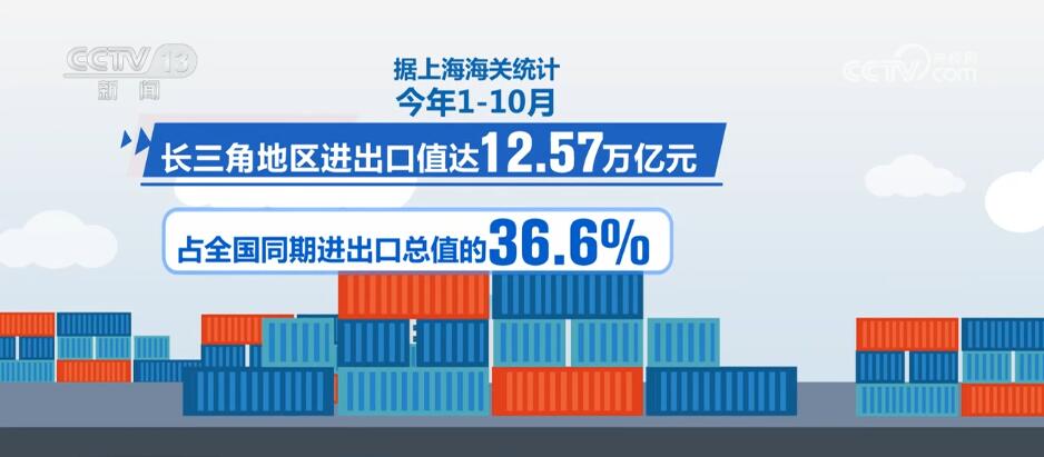 据上海海关统计,今年1—10月,长三角地区进出口值达12.57万亿元,占全国同期进出口总值的36.6%,外贸规模创新高。
