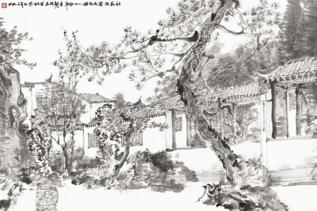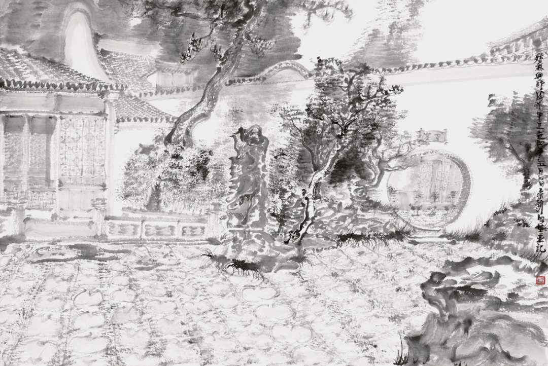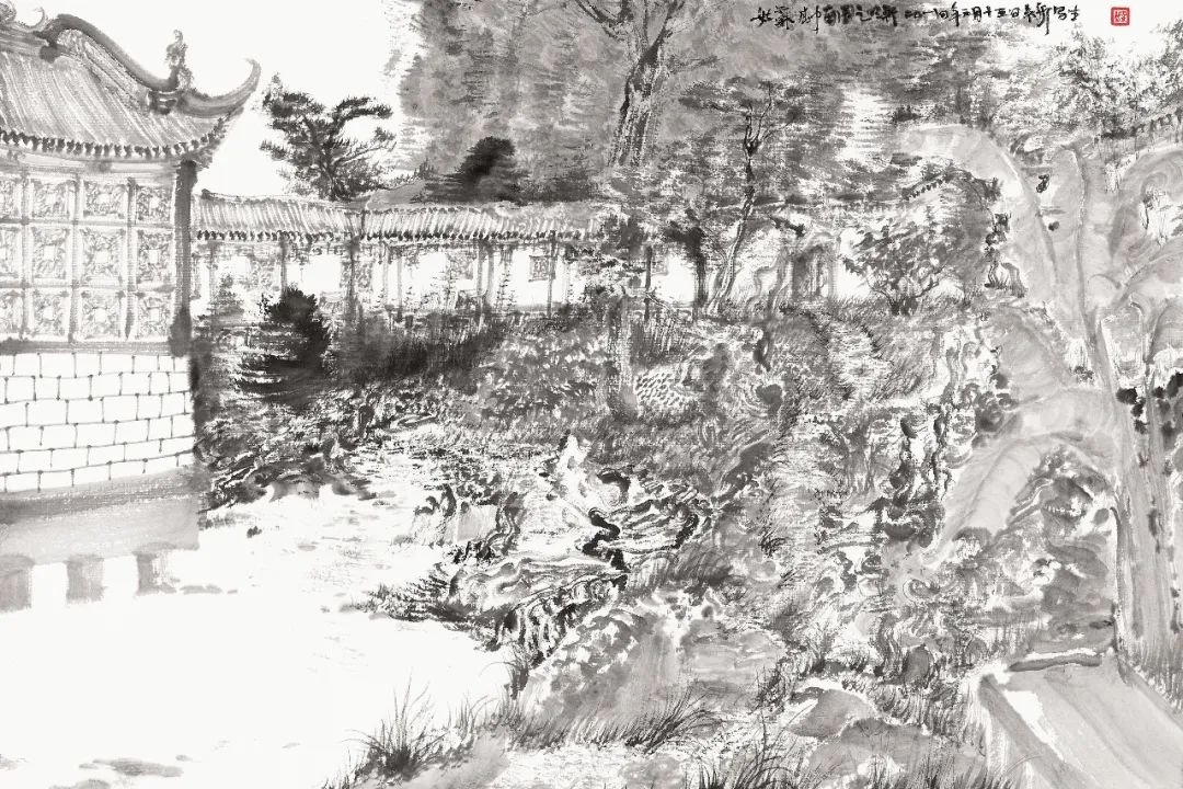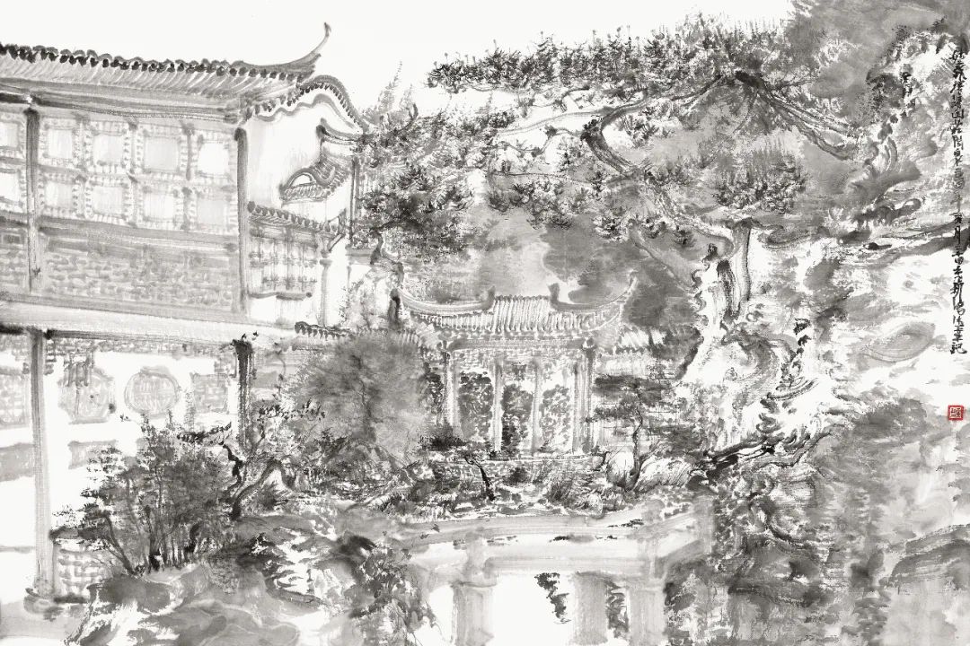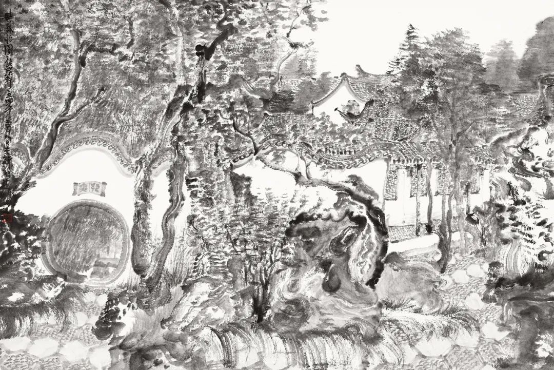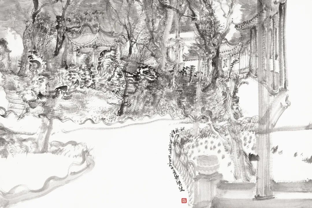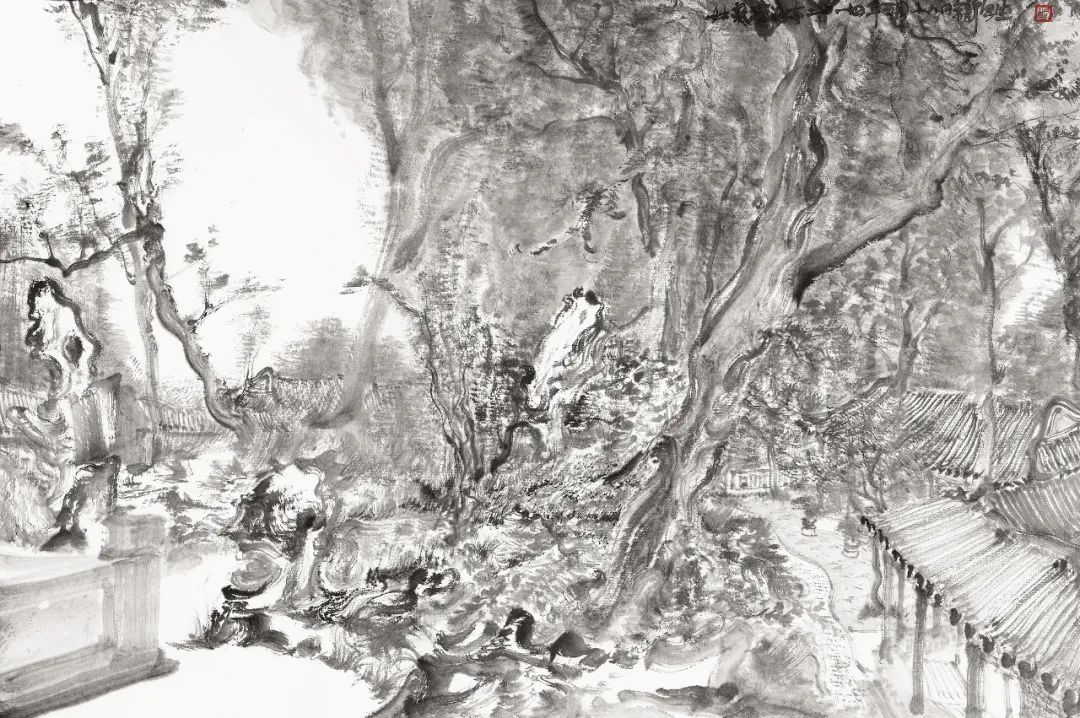 这些观点,都能体现在他近些年的山水写生中。比如《苏州园林写生》系列,他去苏州写生是2014年前后的事,之后又多次在苏州周边的地方画园林。此系列作品,是在笔与墨交织繁杂的结构里写意,笔与墨的勾勒、施染兼备,精心妙造,把本来三维立体空间的现场拉回到二维纸上,其画面上的通透感确却依然具备,浅淡的水墨质地呈现出质感,呈现绘画语言的一份新鲜,形与色上亦多有变化。如以墨分五色的感受力,来评判这样的画,感觉是减掉了枯与焦的变化,在湿、浓、淡三种美感中造出园林的艺术性,整体构图上也类似于照相机取景,具有现代感。在画面中,他凸显了笔墨精妙的把控力,生成出一种梦幻般新空间,这一点恐怕是与许多画园林的画家,在手法上拉开了距离。这样的距离不只是形质上的,而是画家在写生过程中,在强调园林题材的美观与意趣中对自我绘画语言的一种突破,达到了不同于现实园林和古代园林绘画图景中具体的状态,实现了绘画语言的纯粹感。他重视造型美感和园林意识,以独到的手法来完成每一幅作品对意境的营造,既拓展了个人艺术创作语言的边界,又深化了自我对自然山川的刻画,是一种别具一格的创建。