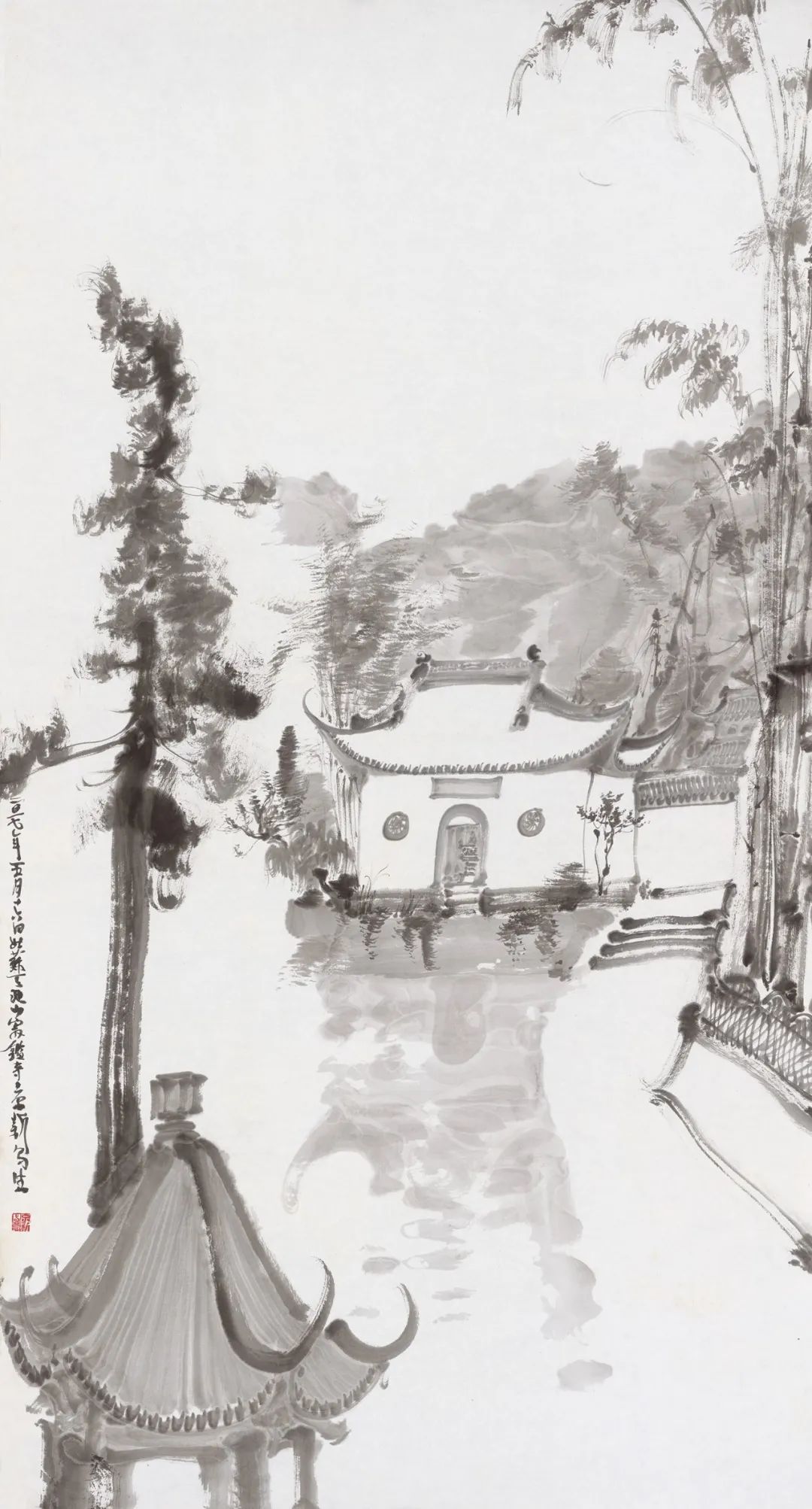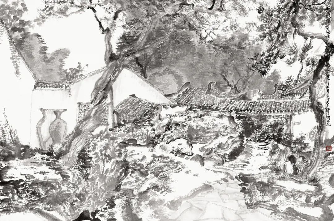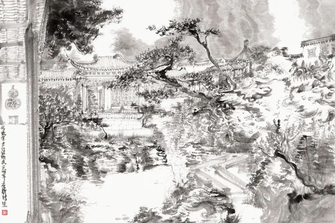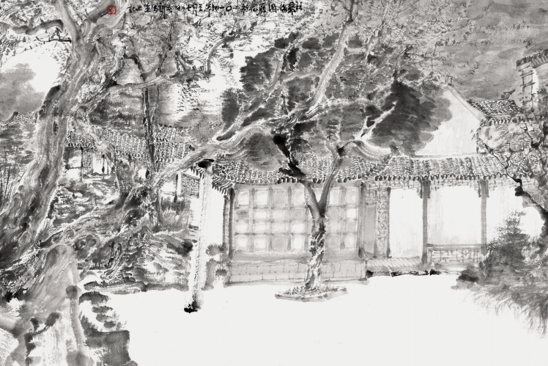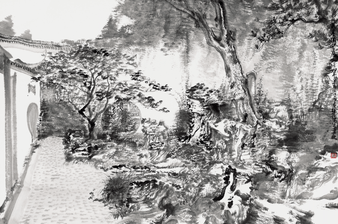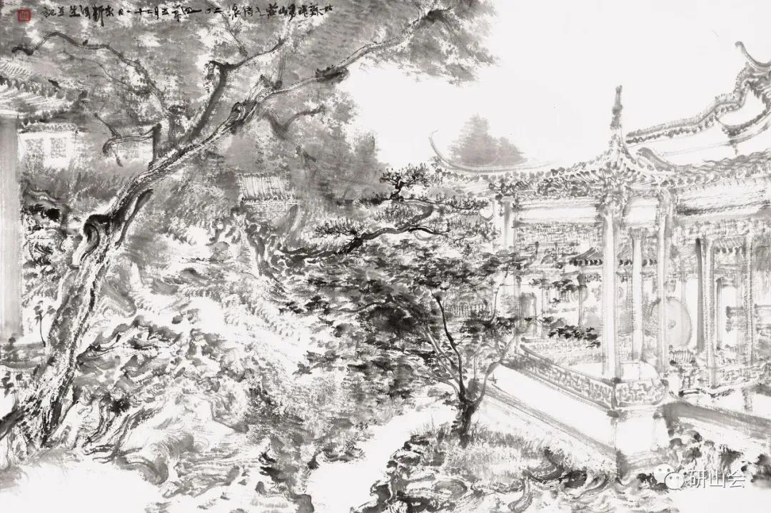 这些观点,都能体现在他近些年的山水写生中。比如《苏州园林写生》系列,他去苏州写生是2014年前后的事,之后又多次在苏州周边的地方画园林。此系列作品,是在笔与墨交织繁杂的结构里写意,笔与墨的勾勒、施染兼备,精心妙造,把本来三维立体空间的现场拉回到二维纸上,其画面上的通透感确却依然具备,浅淡的水墨质地呈现出质感,呈现绘画语言的一份新鲜,形与色上亦多有变化。如以墨分五色的感受力,来评判这样的画,感觉是减掉了枯与焦的变化,在湿、浓、淡三种美感中造出园林的艺术性,整体构图上也类似于照相机取景,具有现代感。在画面中,他凸显了笔墨精妙的把控力,生成出一种梦幻般新空间,这一点恐怕是与许多画园林的画家,在手法上拉开了距离。这样的距离不只是形质上的,而是画家在写生过程中,在强调园林题材的美观与意趣中对自我绘画语言的一种突破,达到了不同于现实园林和古代园林绘画图景中具体的状态,实现了绘画语言的纯粹感。他重视造型美感和园林意识,以独到的手法来完成每一幅作品对意境的营造,既拓展了个人艺术创作语言的边界,又深化了自我对自然山川的刻画,是一种别具一格的创建。