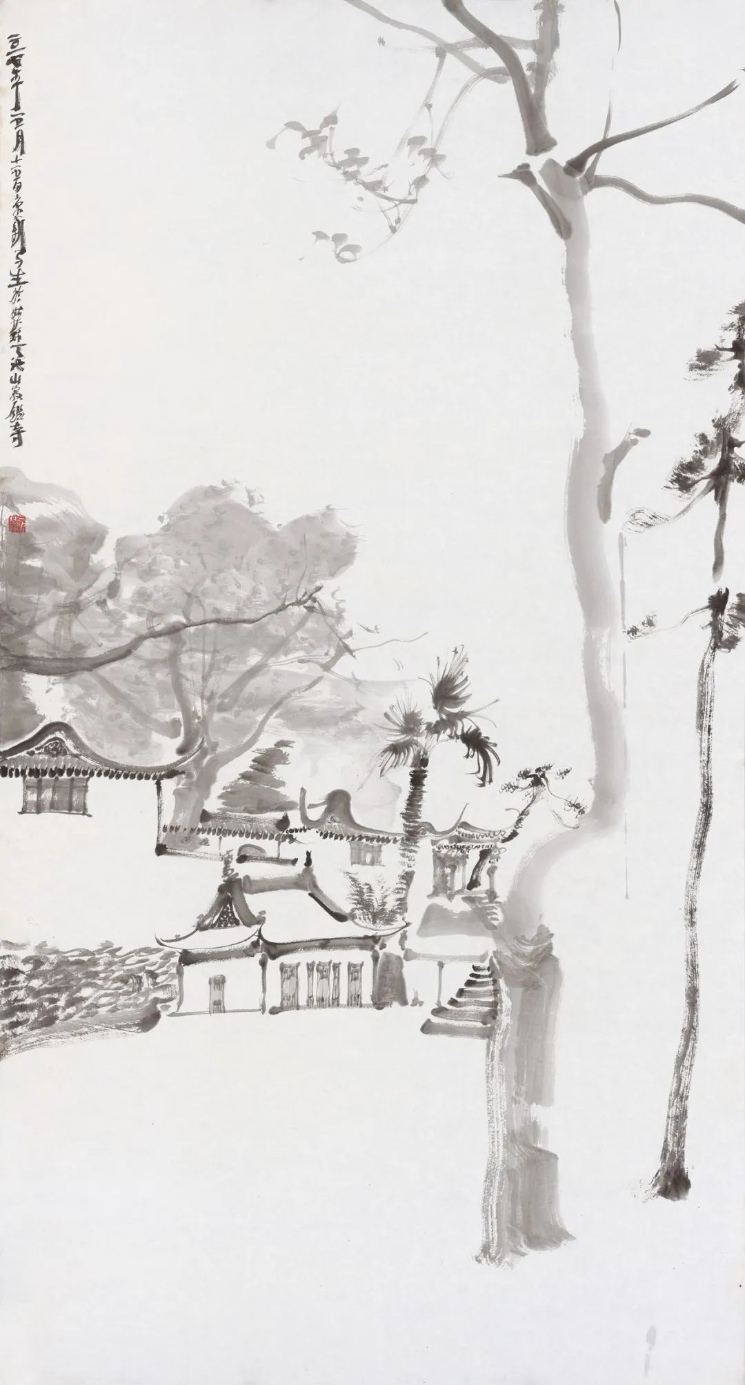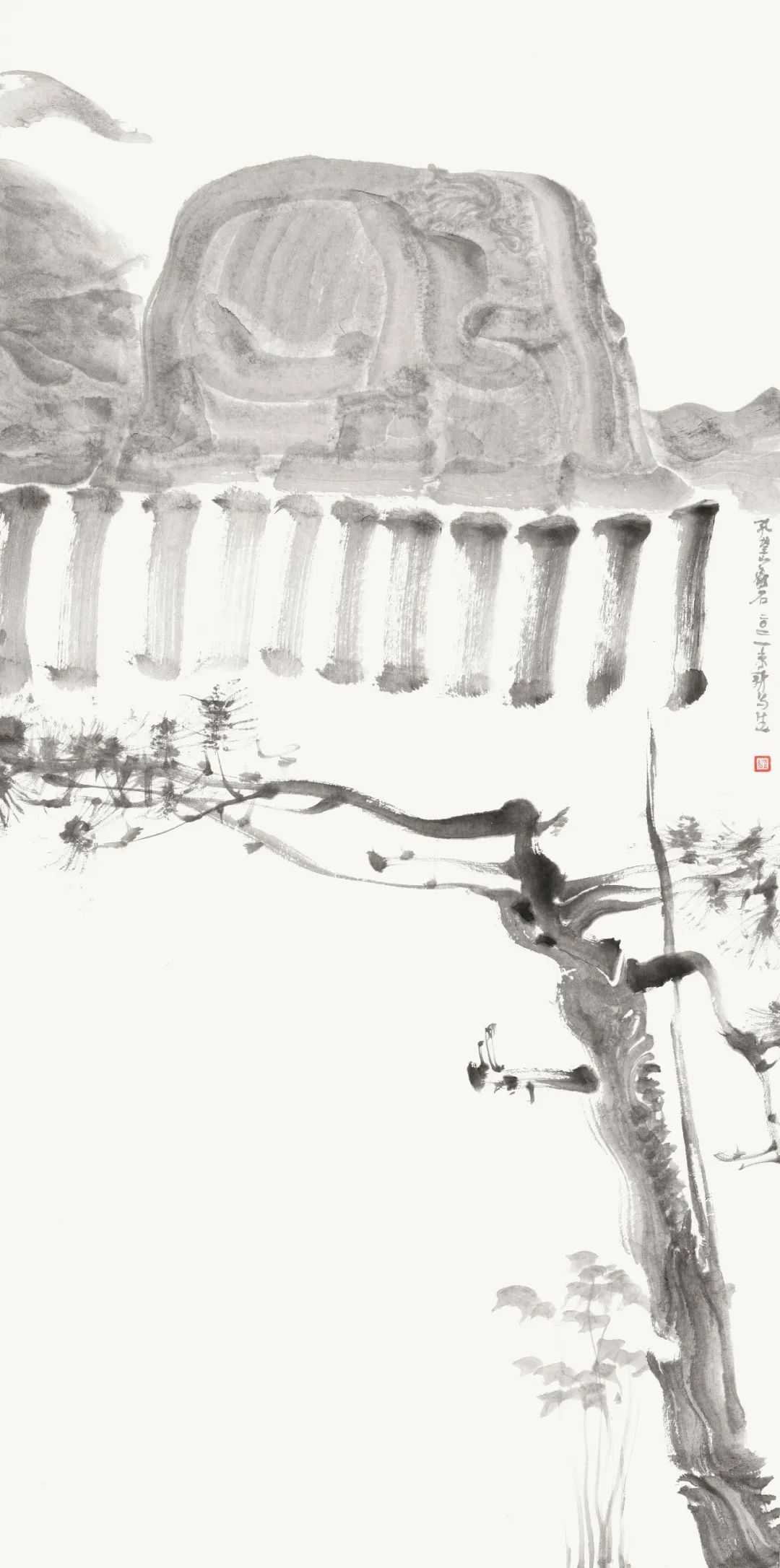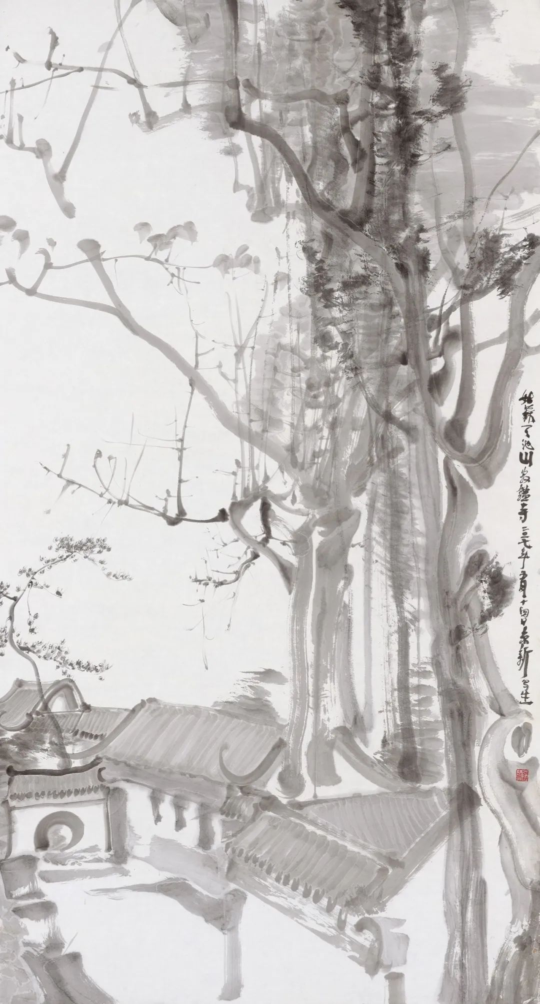 比如2021年的《连云港写生》系列中,将之一至之四几幅画连贯起来看,我想,能看到刻画里的大象造型。这组画的生成,一定是人站在原地从不同角度观察而得,正所谓“一步一景,一画一境”,周京新在感受现场景象的同时,将画面穿插出的树木、台阶、远山,不由得想象当时现场绘画的惊人之举。其实从这组画来看,或许能理解他当年提出过的“水墨雕塑”这一概念。可谓塑形,注重感官来生发意识的新鲜生动。古人曾有“气韵生动、骨法用笔”这样一种价值判断,也成为历代中国画家造化的准绳,也可以说是中国画艺术的命根子,只是每个时代的绘画形式、语言需要自己寻找,自己探索。对于用笔的讲究,是他画画写生最核心的、最在意的一种能力,无论对体面的塑造,还是对线条变化的把控,都独具个人风味。2017年的《天池山寂鉴寺写生》系列共16件作品,其中《写生之四》画面很抢眼,两支树干与寺庙建筑的比例,体验到一种透视和结构的美妙,其建筑的勾勒很严密,精准的实像和大面积的留白促成了画面空间的舒服感,既有点缀,又出笔意,有大有小,有浓有淡,精致又显示出笔法的松脱感,此系列的特点有区别于早些时间的《苏州园林写生》,气质上更加朴拙,也更讲究。