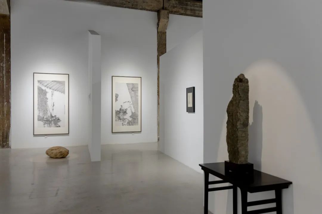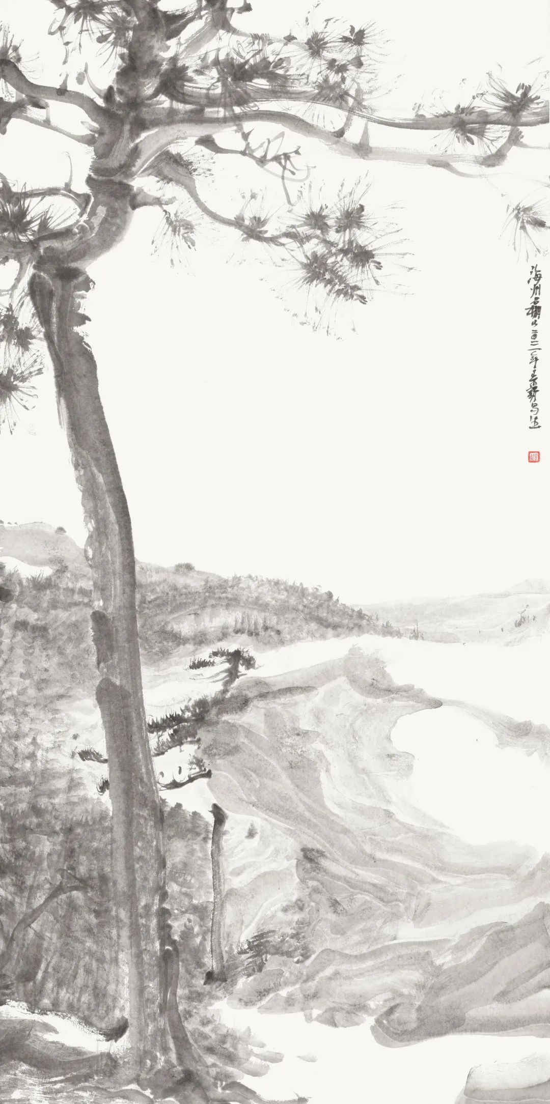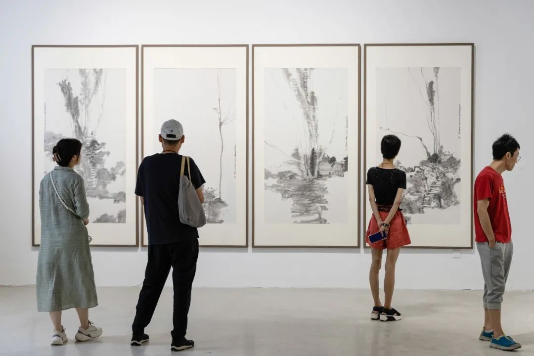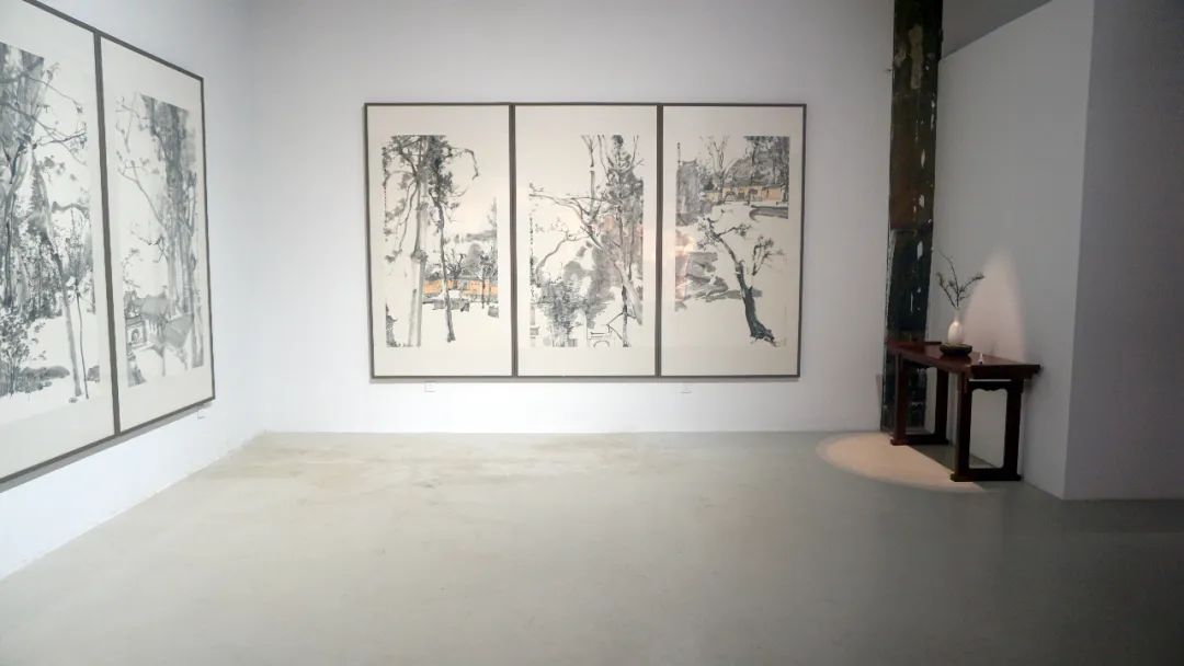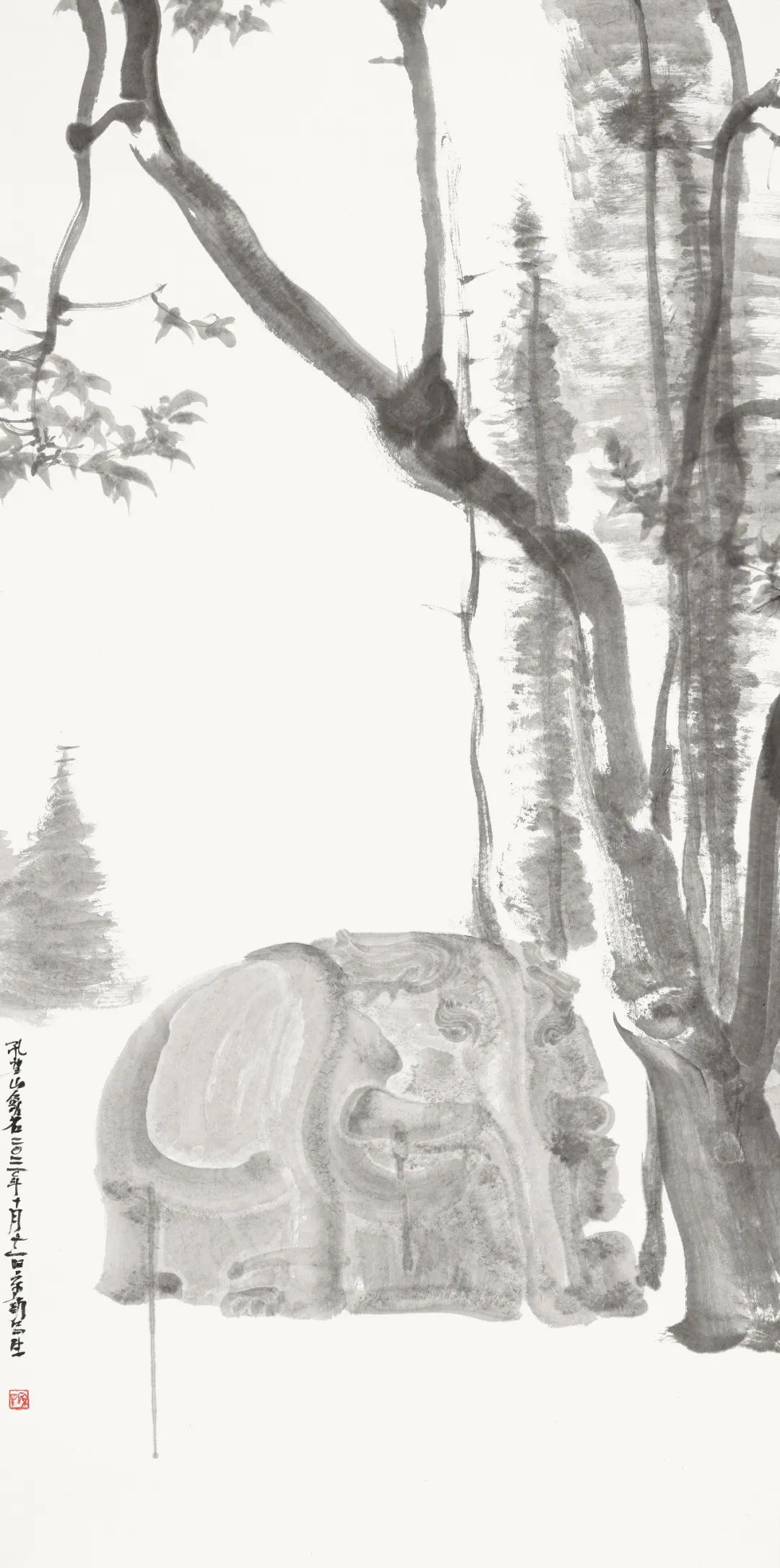 比如2021年的《连云港写生》系列中,将之一至之四几幅画连贯起来看,我想,能看到刻画里的大象造型。这组画的生成,一定是人站在原地从不同角度观察而得,正所谓“一步一景,一画一境”,周京新在感受现场景象的同时,将画面穿插出的树木、台阶、远山,不由得想象当时现场绘画的惊人之举。其实从这组画来看,或许能理解他当年提出过的“水墨雕塑”这一概念。可谓塑形,注重感官来生发意识的新鲜生动。古人曾有“气韵生动、骨法用笔”这样一种价值判断,也成为历代中国画家造化的准绳,也可以说是中国画艺术的命根子,只是每个时代的绘画形式、语言需要自己寻找,自己探索。对于用笔的讲究,是他画画写生最核心的、最在意的一种能力,无论对体面的塑造,还是对线条变化的把控,都独具个人风味。2017年的《天池山寂鉴寺写生》系列共16件作品,其中《写生之四》画面很抢眼,两支树干与寺庙建筑的比例,体验到一种透视和结构的美妙,其建筑的勾勒很严密,精准的实像和大面积的留白促成了画面空间的舒服感,既有点缀,又出笔意,有大有小,有浓有淡,精致又显示出笔法的松脱感,此系列的特点有区别于早些时间的《苏州园林写生》,气质上更加朴拙,也更讲究。
