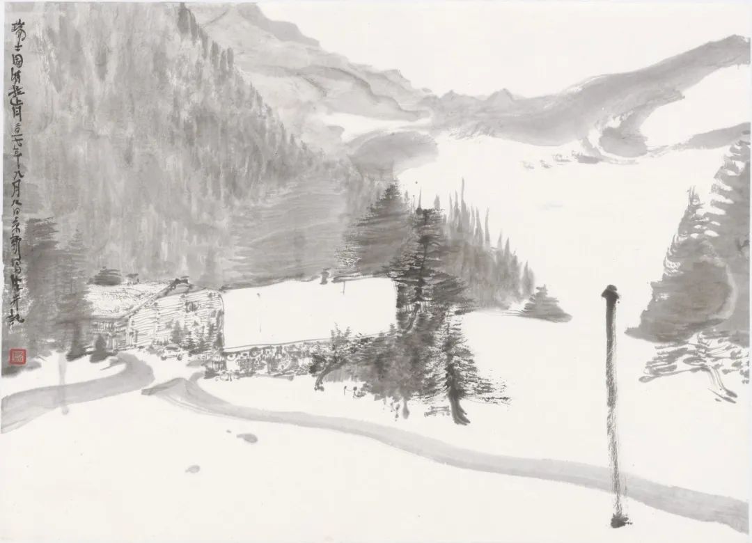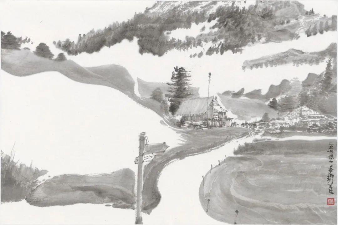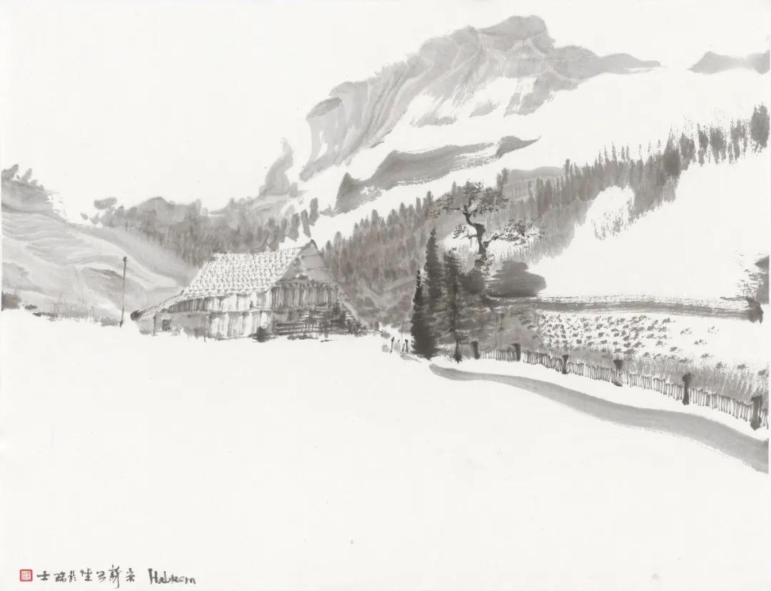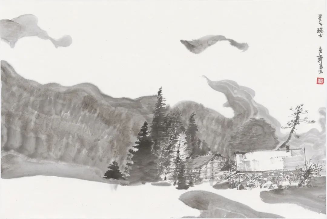 再看《瑞士写生》系列,或许是面对西洋景观,有一种陌生感,画面反而显得笔简墨洁,虚淡清雅,大量的留白和形式构成凸显了淡墨的价值。此处的画面多见曲线来完成,包括远处的山势,近处的块面草地,使画作层层韵味,比如《写生之一》《写生之十三》每一幅都妙不可言,由此想象到山水,也是可以由小观大,意味深远的。这也让我想到沈括在评王维画作《袁安卧雪图》时的一段话:“此乃得心应手,意到便成,故造理入神,迴得天意,此难可与俗人论也。”说明绘画之事,是要合于事理,技艺达到神妙境界,深得自然情趣才行。