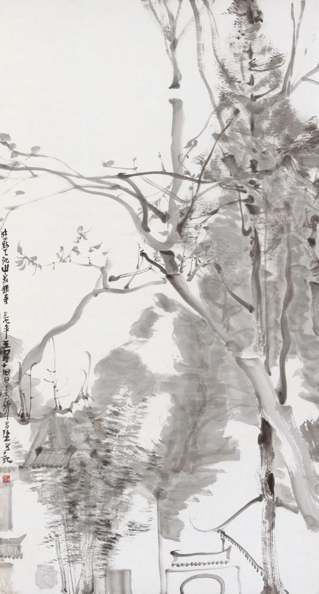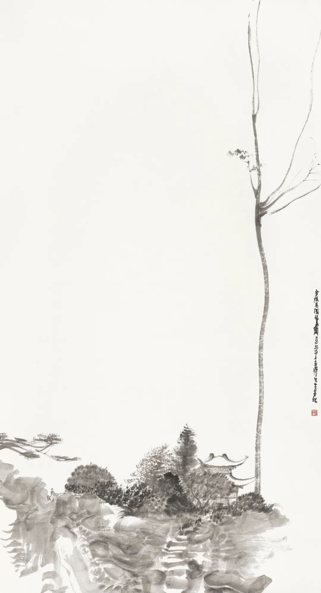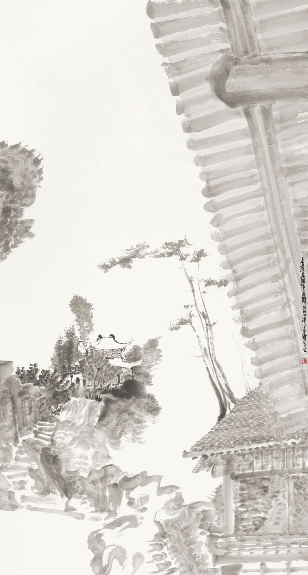 《愚园写生》系列中的作品,如《愚园之八》,想必是从屋檐口下写得,近处的内瓦檐成斜面状,占据了画面的一大块,而远处的亭台楼阁在山石、树木的映衬之下,显得很远,这种视觉或许不只是所谓的透视法可以去解读的,比如远处的景富于想象的意味,再加上留白给予画面的虚空境界,那些虚和实、远和近、疏与密、浓与淡的表现力,让画面清雅且韵味十足,凸显了形质的高尚,这都是他一笔一笔生发而得。所谓“由心而造,具有独到”的视角和艺术构想,包括写生其他作品时,同样也是按照这种合理的品位在营造,一看就知道是他的手法,而且这些现场的取舍和大尺幅的画面营造(180×90厘米)也凸显出他对于大幅作品现场写生的驾驭能力,既挑战自我,也具有一种时代感。