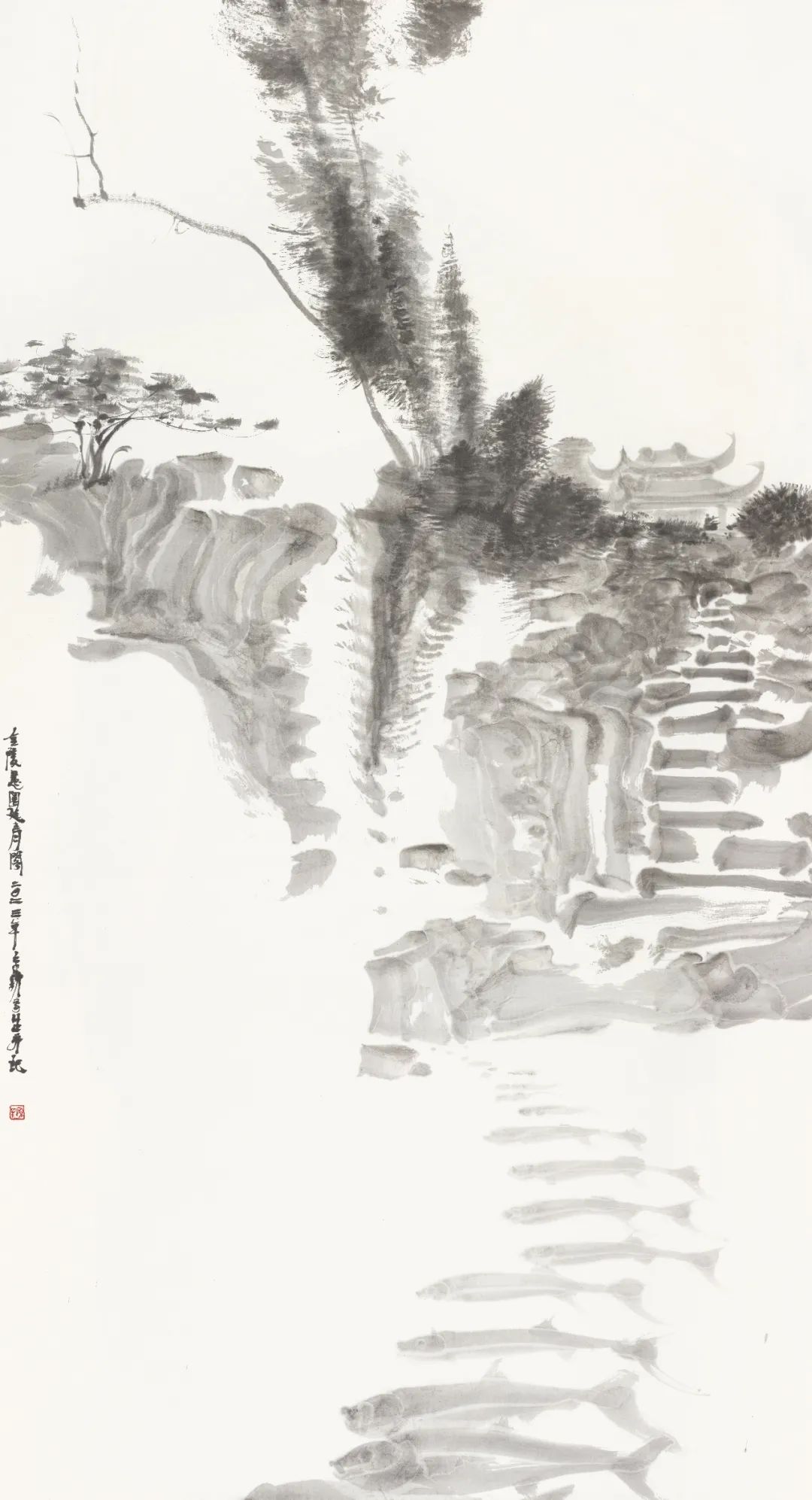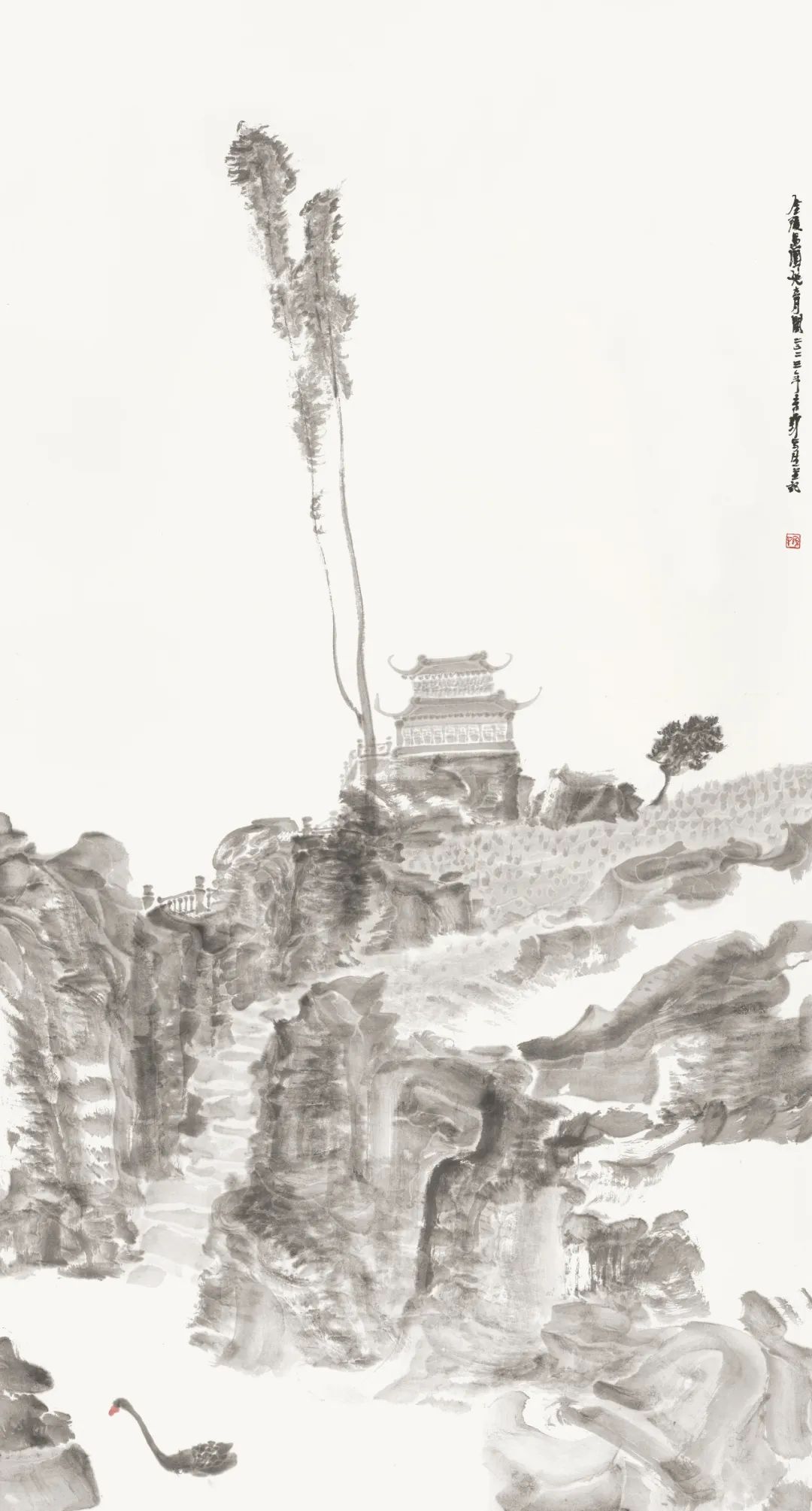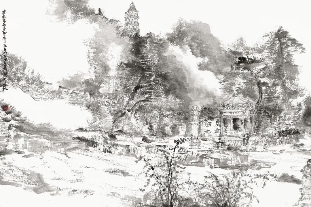 当各类山形地貌,园林楼台,寺庙幽谷,崖壁险境,异域风光都归于他笔下时,变得简而有风姿,虚而灵变,形色纯净,境界空濛,恰如董其昌所指的“南北宗”里“南宗”的精髓与魂魄,以平实、淡雅、柔顺,而化天地之精神来呈现审美的高尚,很明显是在艺术气质上追求“米氏云山”“云林意境”“董氏含蓄之美”,但形色也不再是他们,而是周京新自己。他也曾讲到“要重视感而觉的集录”,有言:“笔可以是点、线、皴,笔更可以只是笔;墨可以代表所有的颜色,墨更可以不代表任何颜色。”理解得真是到位。