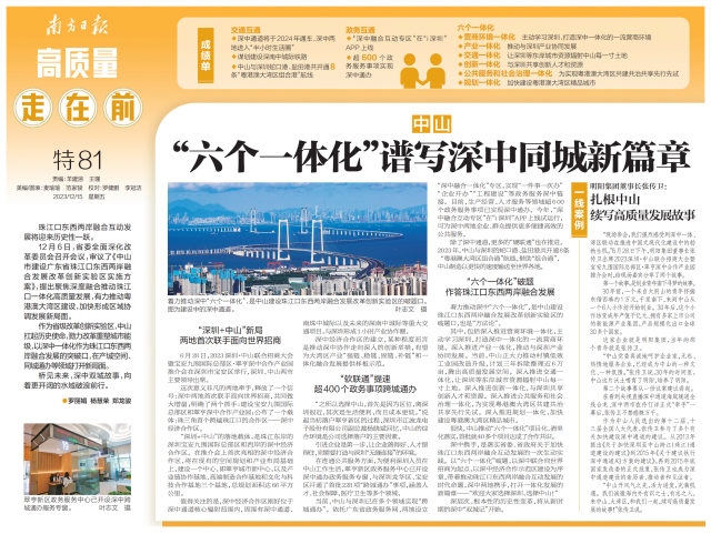 当前,中山与深圳已在多个领域实现“跨城通办”。依托广东省政务服务网,两地设立“深中融合一体化”专区,实现“一件事一次办”“企业开办”“工程建设”等政务服务深中链接。目前,已实现生产经营、人才服务等领域超600个政务服务事项深中通办。今年,“深中融合互动专区”在“i深圳”APP上线试运行,可为深中两地企业、群众提供更多便捷高效的公共服务。
