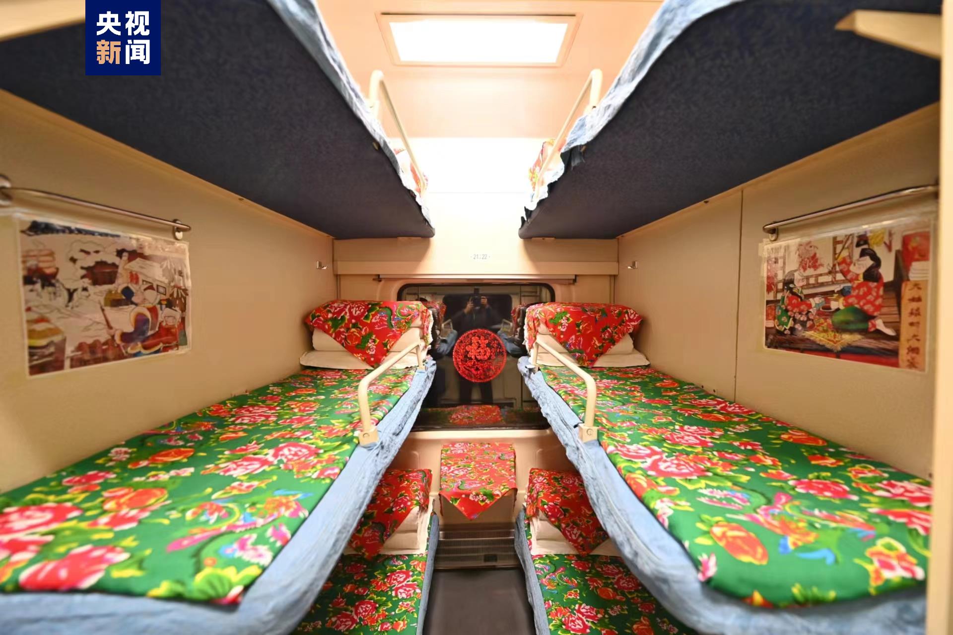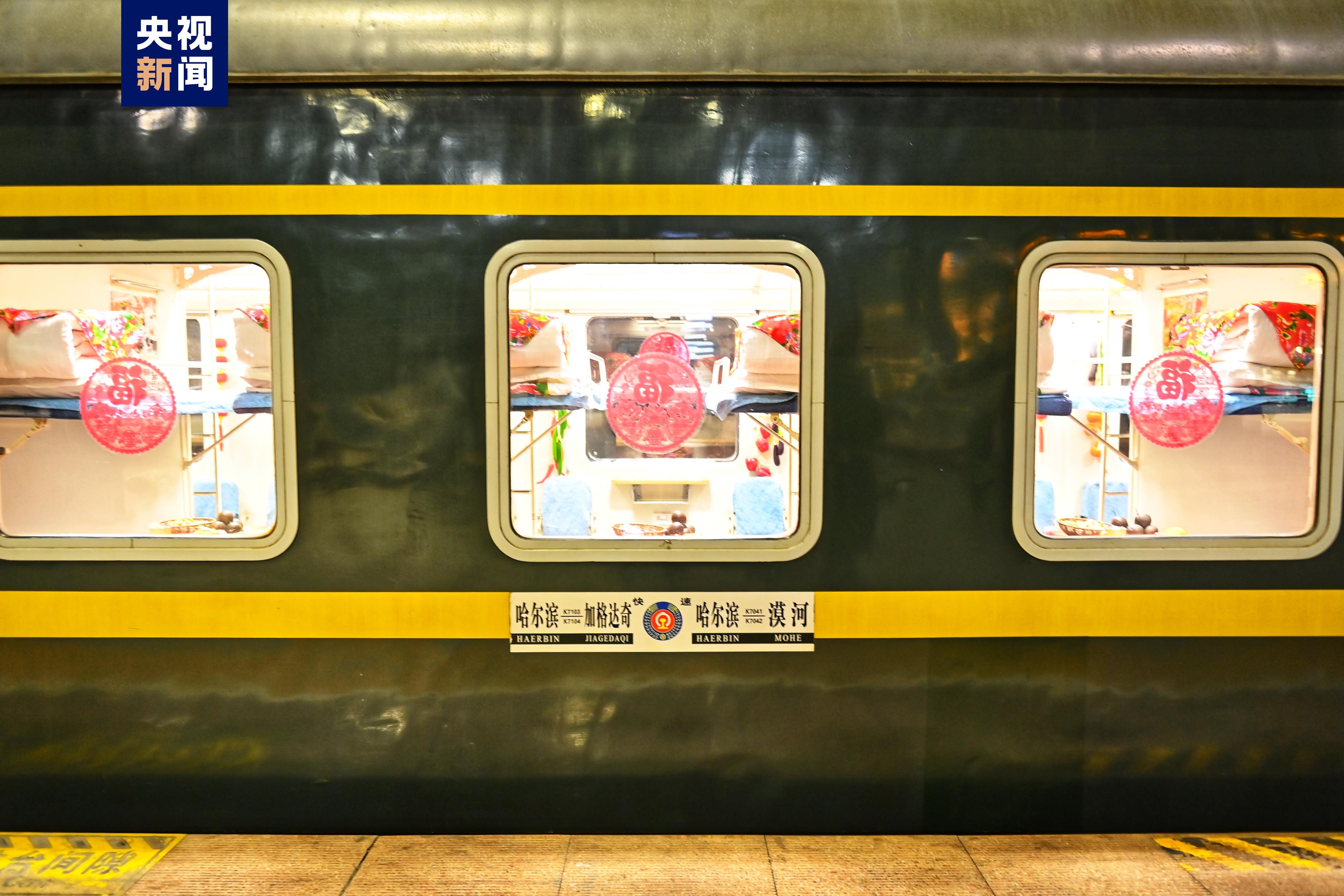 东北红绿花、传统年画,把特色“东北炕头”搬进火车车厢。12月15日,以东北民俗风格打造的哈尔滨至漠河K7041次主题车厢旅客列车正式启程,这是今冬黑龙江省开行的首列东北民俗文化主题列车。