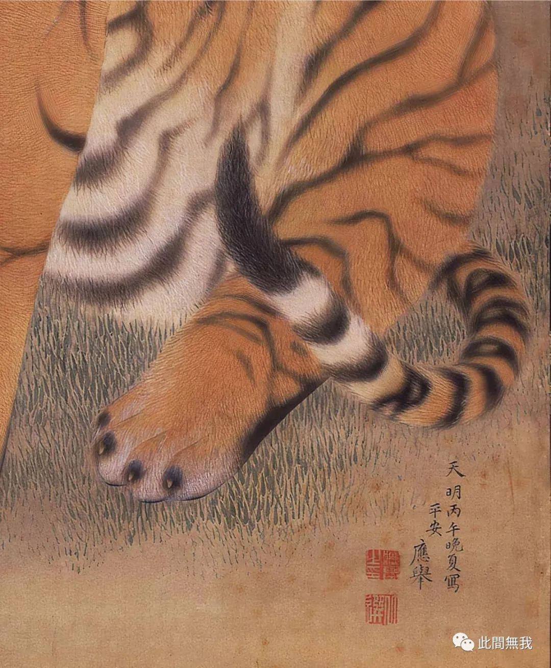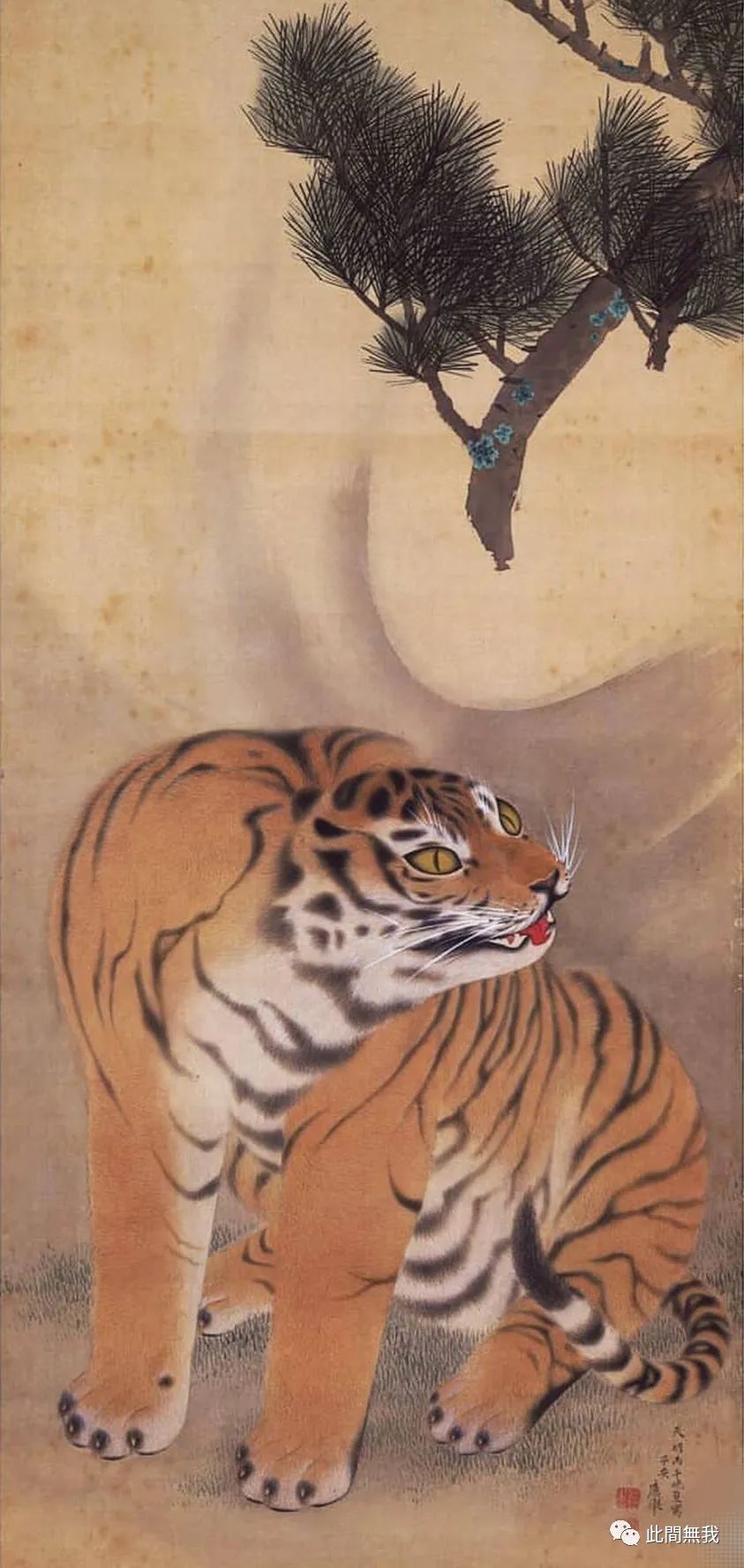 自近代以来,西风东渐,画虎这个古老而冷门的题材得到了长足的发展。日本有圆山应举等将皮毛刻画得惟妙惟肖而又兼顾准确的造型,后面此种风格日本画坛再无超越,而这在一定程度上也预演了中国二十世纪将要走的路。