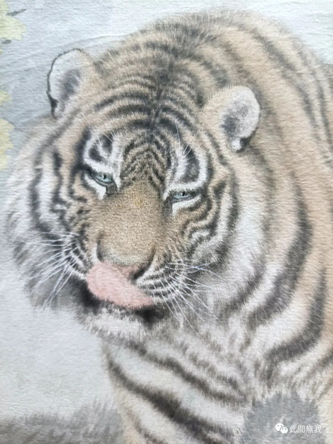 他同步将老虎和背景山水推向写实,无论虎还是景都比古人更“真”。但是这种“真”,并不是在写实的道路上直接对标古典油画或者照片,而是在和照片有一定距离的地方及时停下——这是我认为冯大中画虎最智慧的地方——并且通过淡化的色彩、重新组织的条纹、脸谱化的五官、朴拙的造型等有意或被迫地保持着这种距离,而这种距离之间,让绘画的玩味性和画家的个性风格充分地生长。