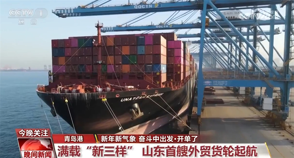 新年伊始,山东首艘外贸货轮从青岛港起航。3500多个标箱里满载包括电动载人汽车、锂离子蓄电池、太阳能电池等外贸“新三样”,总货值约2亿人民币。