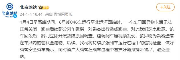 央视网消息:据@北京地铁 微博通报:1月4日早高峰期间,6号线046车运行至北运河西站时,一个车门因异物卡滞无法正常关闭,影响后续部分列车延误,对乘客出行造成影响,对此我们深表歉意。该车回段后,我司立即开展故障原因调查,经调阅车厢视频发现,该异物为乘客遗落在车厢内的管状金属物。后续,我司将持续加强列车运行过程中的巡视检查,做好乘客安全乘车提示,同时请广大乘客在乘车过程中看护好随身携带物品,避免遗落。