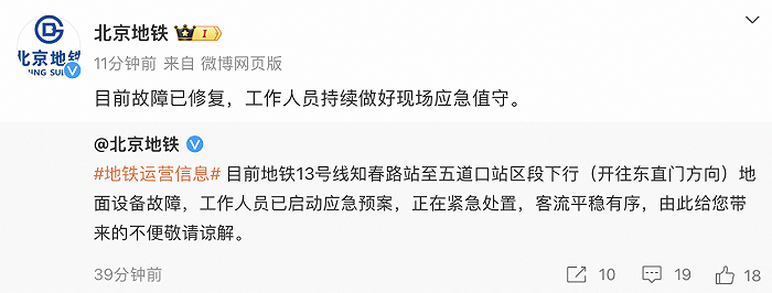 据@北京地铁 微博最新消息,地铁13号线知春路站至五道口站区段下行(开往东直门方向)地面设备故障已修复,工作人员持续做好现场应急值守。