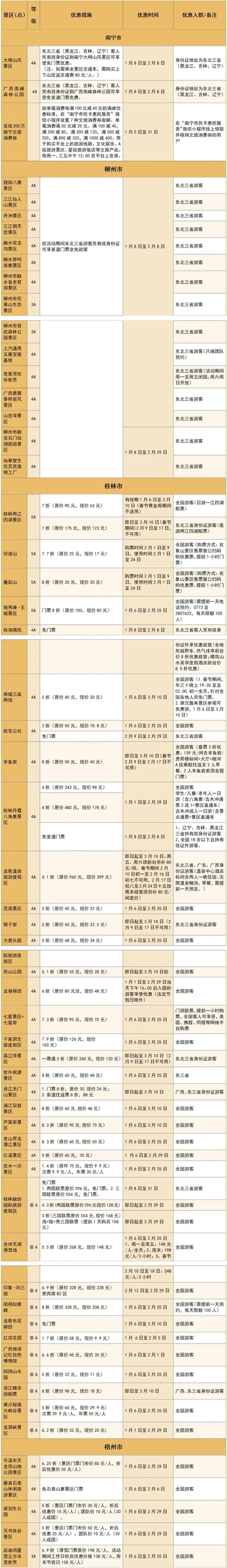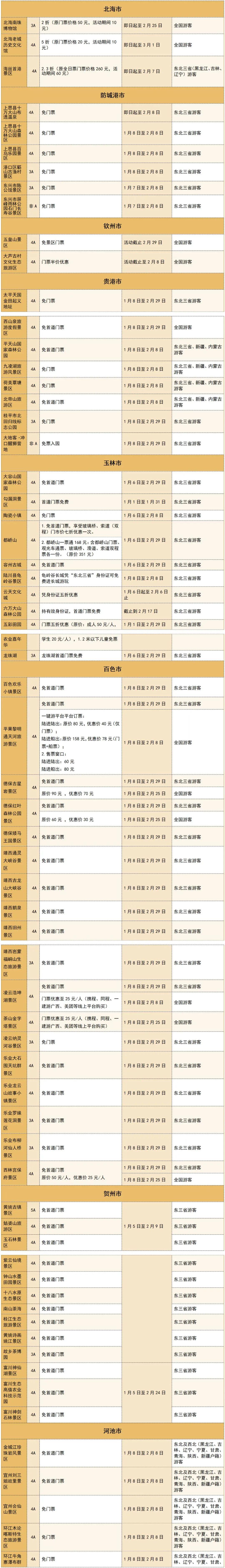 柳州程阳八寨景区、桂林桂海晴岚、百色靖西通灵大峡谷景区、百色乐业大石围天坑群景区、贺州黄姚古镇景区、河池罗城棉花天坑度假区、崇左德天跨国瀑布景区、崇左大新县明仕景区、崇左左江花山岩画景区等等,近两百家广西景区面向东北“老铁”推出免门票或打折优惠政策!此外,还有多家景区面向全国游客推出优惠政策!